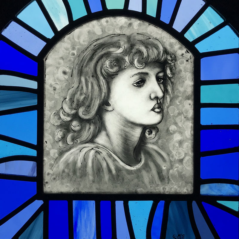 Vitreous paint, float glass and scrap glass. "This is part of a triptych in the Mother and Daughters series that I am working on looking at the complicated relationship that artists can have with their female muses. Jane's soulful eyes reach out from the past to us, as drawn by her lover Dante Gabriel Rossetti. Even though she is immortalised as the subject/object in numerous paintings I have always felt that in so many ways she has been underestimated."