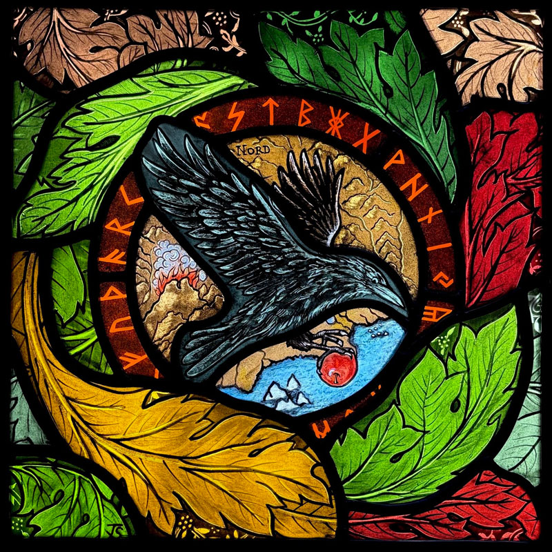 Lamberts Glass, painted, silver stained, engraved, enamelled. "William Morris was deeply influenced by the medieval sagas of Iceland, which shaped his view of the best life a man could live. I've chosen to illustrate the story of King Rerir and his wife who long for a child. Odin and Freyia hear their prayers and send a fertility apple to them using their maid who takes the form of a crow."